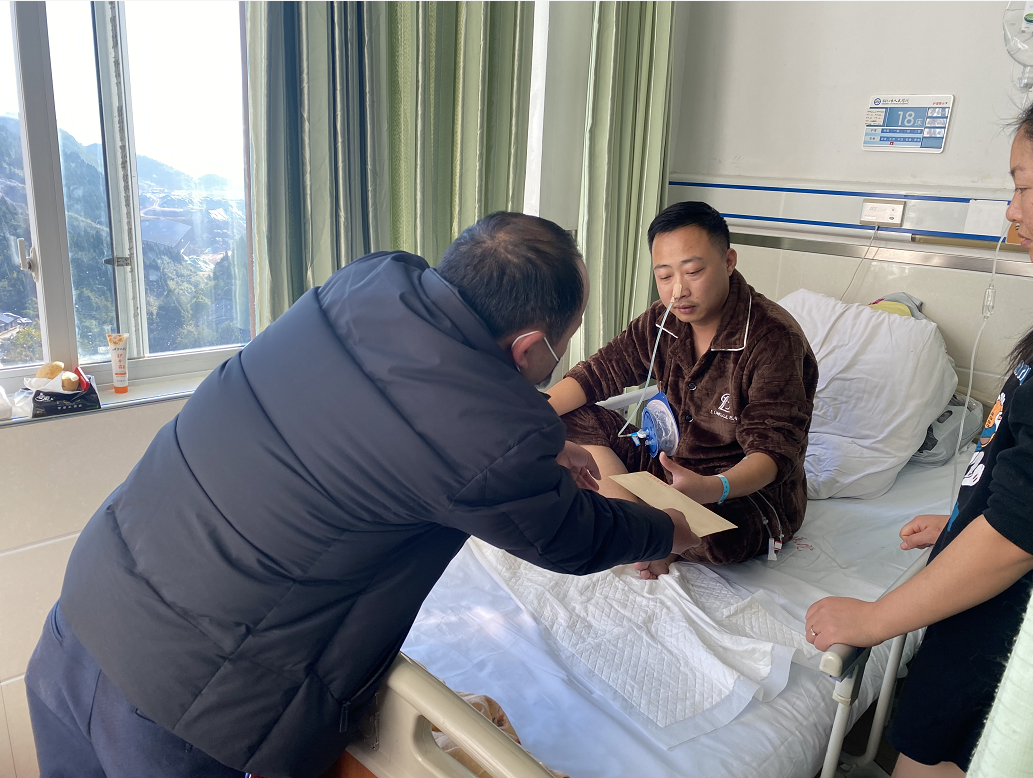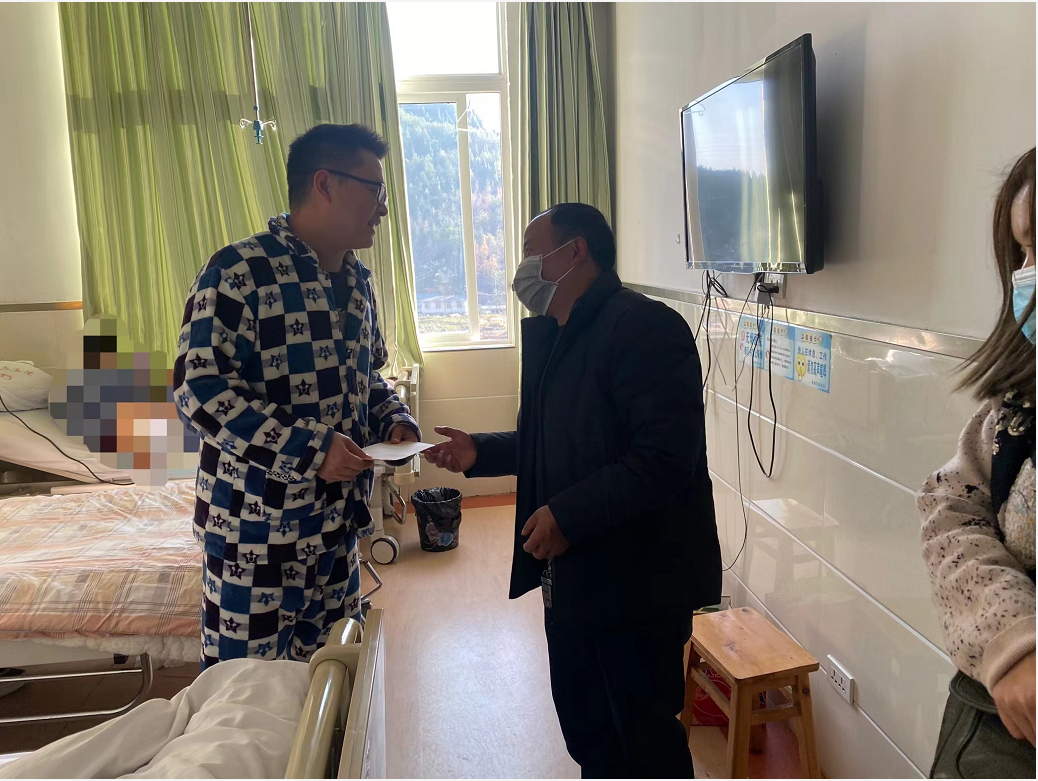 杨光智传达了公司领导的关爱与嘱托,详细了解了他们的病情,叮嘱他们在治疗修养期间好好休息,不要忧心工作,让他们保持乐观心态,积极配合治疗,争取早日康复,并送去了慰问金和慰问品。