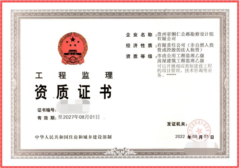 8月1日,bv伟德国际1946(以下简称公司)取得房建、市政工程监理乙级资质证书。截至目前,公司已拥有工程设计公路行业专业乙级,市政行业(桥梁工程、道路工程、给水工程、排水工程)专业乙级,工程勘察(岩土工程勘察、工程测量)专业乙级,工程咨询乙级、工程测绘乙级和工程监理(房屋建筑工程、市政公路工程)乙级等多项资质证书。